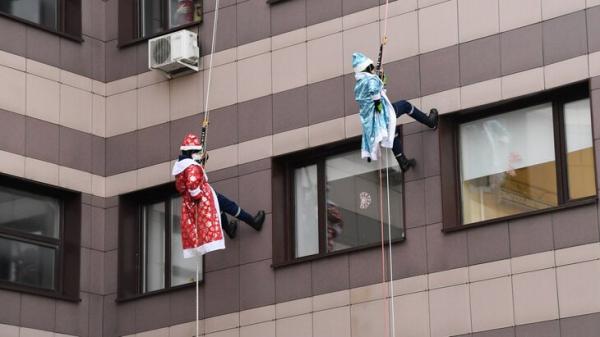 Для этого используется альпинистское снаряжение. Также их сопровождают снегурочки, которых поднимают к окнам в люльках пожарных автолестниц.