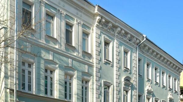Специалисты не только расчистили фасады, отремонтировали штукатурный слой и заделали трещины, но и бережно вернули красоту архитектурному декору. Помимо этого, в местах намокания нанесли биозащитный состав, а дом окрасили в оттенки «светло-желтая пшеница» и «флорентийский коричневый». Также они заменили водосточные трубы, отремонтировали балконы и входы, заново создали цокольное покрытие.