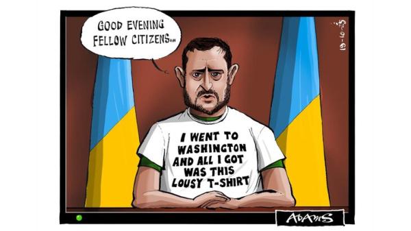 Британская газета The Telegraph опубликовала карикатуру на украинского президента Владимира Зеленского, высмеивающую его поездку в Вашингтон, которая не принесла Киеву ожидаемых результатов.