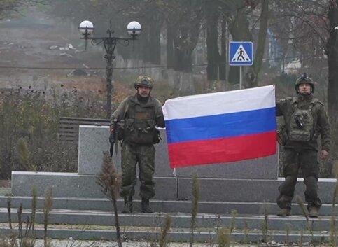 На видео российские бойцы развернули флаг России на площади Шибанкова, напротив Красноармейского индустриального института Донецкого национального технического университета.