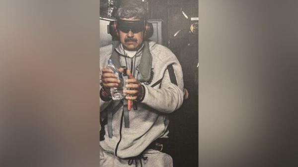 На нем видно, что венесуэльский лидер одет в серый костюм, в руках он держит бутылку с водой. Глаза его закрыты черной маской.