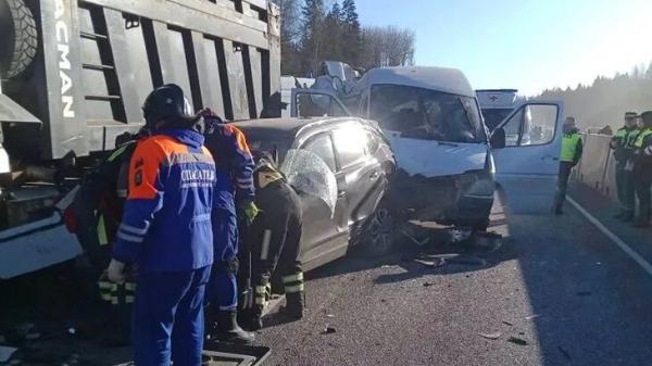 Там грузовик Shacman, следовавший из Отрадного в Гатчину, столкнулся с четырьмя другими авто: микроавтобусом Mercedes Sprinter, кроссовером Chery Tiggo, грузовиком DAF с прицепом и легковым Renault Logan.