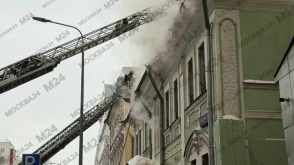 Огонь охватил чердак и кровлю в здании на улице Образцова в Москве